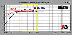 Kicker традиционно щедр и либерален, когда дело доходит до рекомендаций по оформлению: ЗЯ от полусотни литров до полутора сотен плюс два «фазика», тоже сильно неодинаковые. Получающиеся АЧХ — перед вами, комментарии излишни. По нашим данным, у головки значительно больший, нежели предполагалось, эквивалентный объём и более низкая полная добротность. По расчётам это нам на руку: идеальным объёмом ЗЯ оказывается 23 — 25 л, Объём фазика с наиболее разумной АЧХ 40 л, частота настройки 32 Гц. Правило EBP работает, акустическое усиление у фазоинвертора ниже, чем у предыдущих участников.
