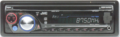 Передняя панель кажется немного простоватой из-за сочетания красной и синей подсветки, зато в фирменной принадлежности аппарата сомнений не возникает. Органы управления выполнены в фирменном ключе и потому будут удобными всем тем, кто к аппаратам JVC привык. Если бы спросили меня, я бы сказал, что замена «креста» качающейся кнопкой (слева на панели) не совсем шедевр, и эргономика кнопки Band далека от оптимума, но кто меня станет спрашивать? Энкодер, как водится, поводов для критики не даёт. Панель снимается и устанавливается без каких-либо проблем. В комплект входит известный пульт ДУ типа «брелок». Одно из немногих его достоинств в том, что на связке с ключами он потеряется или забудется дома только вместе с ключами. Лично я надеялся, что в линейке 2009 года этому пульту будет найдена более адекватная замена. Одно из отличий аппарата JVC от предшественников по группе — специализированная шина для управления айподом. Для его подключения потребуется кабель KS-U18, который использует также и гнездо USB. (Отсюда делаем вывод, что плеер «всех времён и народов» подключается по цифре.] Звуком заведует трёхполосный тембр. Линейный выход можно перевести в режим Sub. Управление диммером на любой вкус: ручное либо автоматическое. Приятно, что при его включении снижается и яркость подсветки кнопок. Уровни подсветки дисплея в том и другом режиме подобраны должным образом.