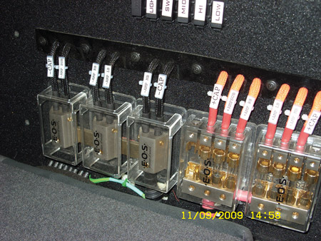 Перегородка моторного отсека не имела ни одного пригодного отверстия для прохождения в салон, поэтому пришлось протягивать под защитой крыла и выходить в около левой передней двери. В салоне были проложены кабель-каналы из пластика, которые закрепили на стекольный герметик с помощью хомутов в технологических отверстиях. Межблочные кабели и силовые провода были проложены по правому и левому борту, а акустические протянули по крыше. Все провода уложили в гофру и термоусадку, некоторые в «змеиную кожу». Весь этот комплекс представляет более чем достаточную защиту, вопросов ни одного раза не возникло. В ассортименте минусовых дистрибьюторов Е.О.S. не нашлось ни одного на четыре потребителя, поэтому была изготовлена шина, которая соединяла три двойных. Концы всех проводов заделали обжимными наконечниками, использовали цветовую маркировку, а также специальные стяжки, имеющие площадки для маркировки.