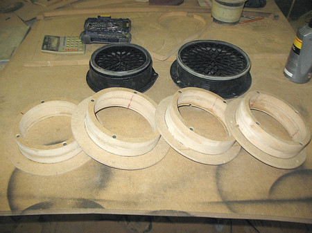 Главная автоакустика состоит из следующих деталей: опорные кольца с размерами равными штатным пластиковым стаканам, новая сетка, помещенная в рамку из стеклокомпозита и обшитая кожей