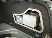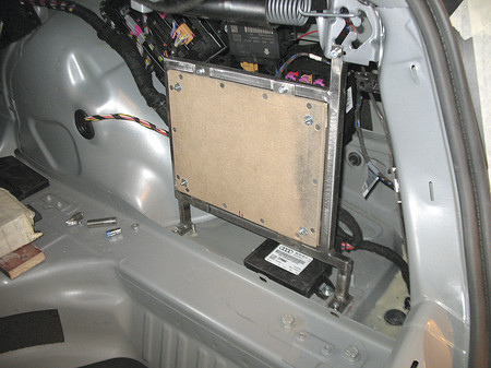 Усилители автомобильные вставлены в стальные откидные рамки и композитные фальшпанели. Лишь слева, где места было побольше удалось поместить 4-фарадную емкость