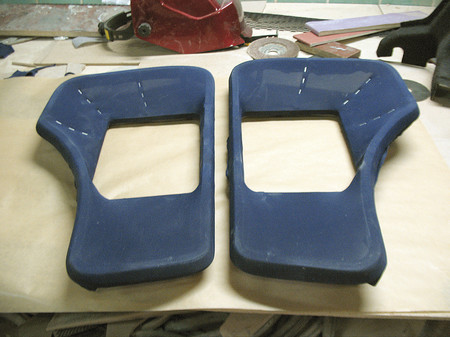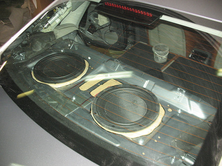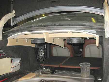 Чтобы сабвуферы поместились в заднюю полку пришлось вырезать соответствующие по размерам отверстия, а сами головки разместить в панели, сделанной из двух слоев MDF со специально созданными шпангаутами, вдоль которых вклеивалась стеклопластиковая скорлупа