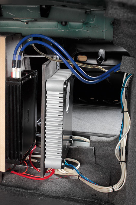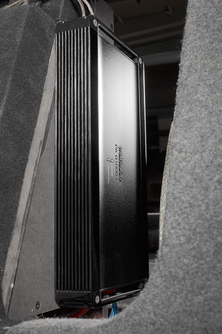 Для подготовки корпуса под саб специалисты использовали качественный ящик, имеющий трапециевидную форму. Расположили его непосредственно за задним сидением. А вот усилители автомобильные требуют отдельного внимания. Специалисты решили оснастить фронт Polk Audio PA D4000.4, а вот в отношении тыла была применена более новая версия. Для того чтобы добиться более высоких результатов по акустике, дополнительно установили соответствующие компоненты. Специалисты также решили воспользоваться тем усилителем, который был ранее установлен в транспортном средстве. Все потому, что под подготовленную систему он подошел отлично. Стоит отметить, что используемые в данном случае усилители относятся к импульсному типу. Именно это позволило скоординировать мощность, а также минимизировать потребление энергии. Для прикрытия всей системы использован специальный корпус, подготовленный из обыкновенного материала.